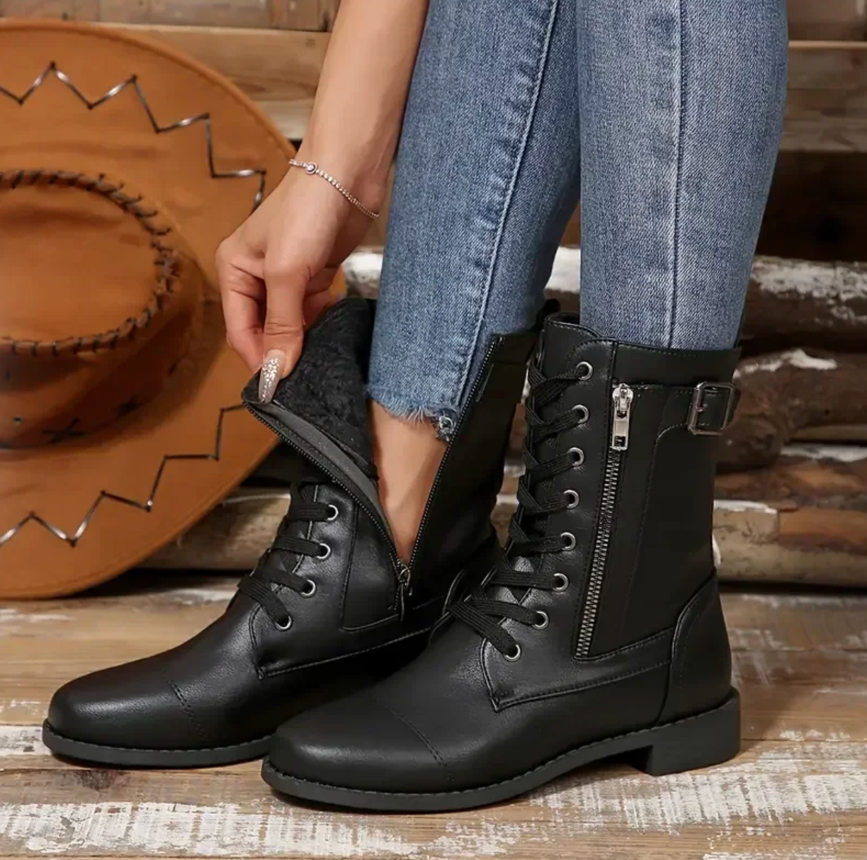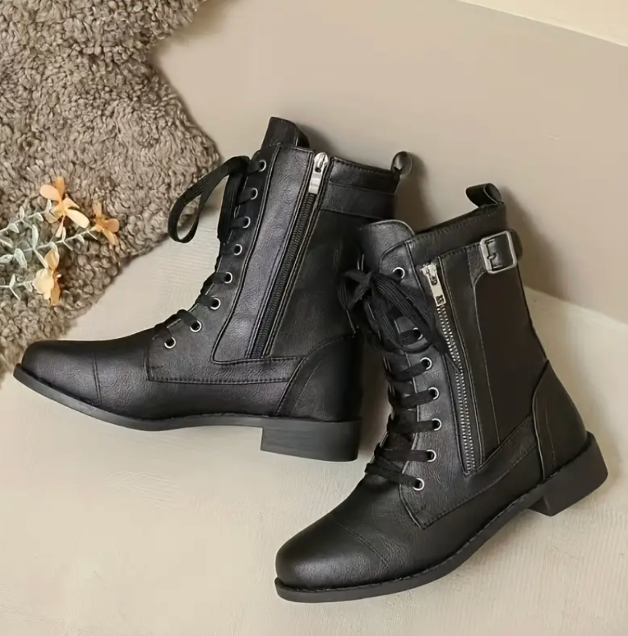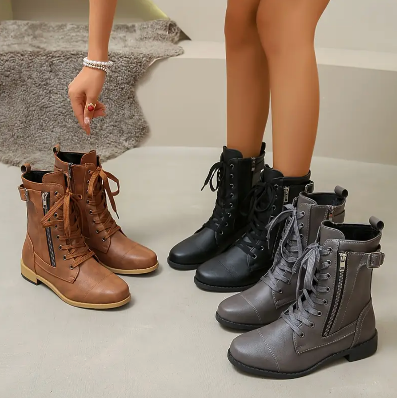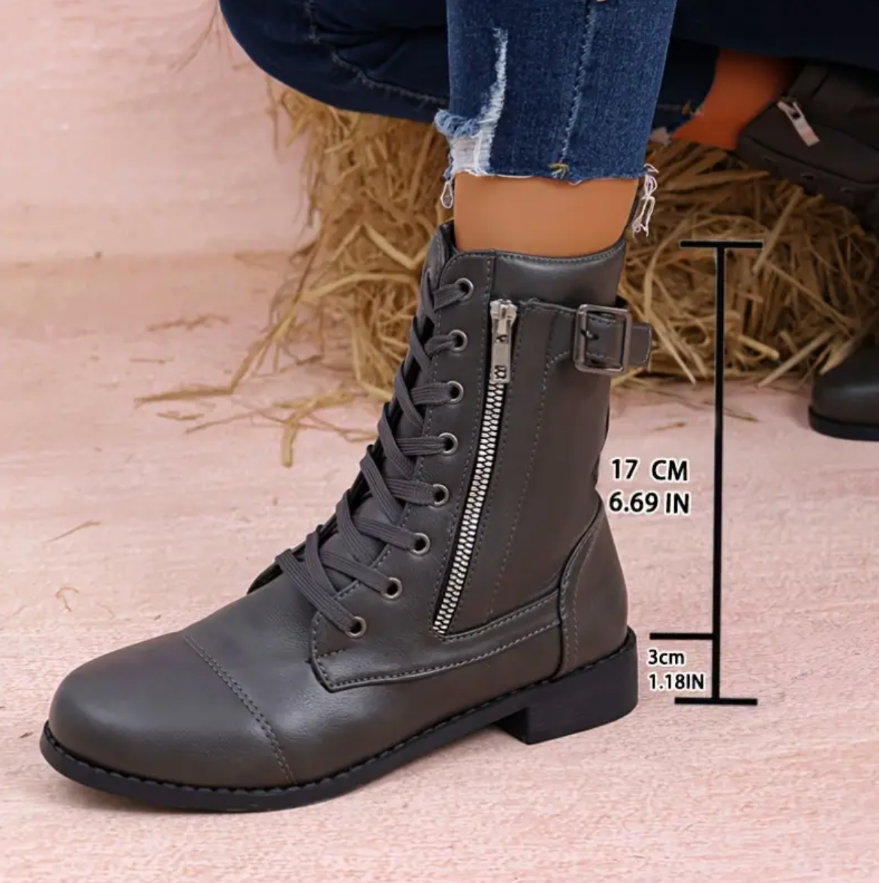 Realizzati in ecopelle di alta qualità , si distinguono per la loro linea contemporanea e femminile, arricchita da lacci frontali regolabili , cerniera laterale per una calzata rapida e fibbia decorativa che aggiunge un tocco di carattere.